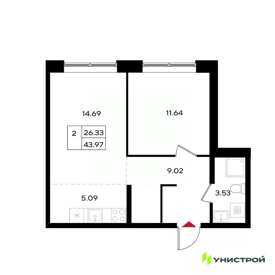 Общая площадь43,97 м2