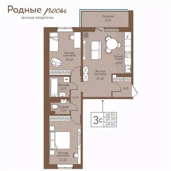 Продаётся 3-комнатная квартира в строящемся доме (Академическая, 9), срок сдачи: III-кв. 2027, общей площадью 58.6 кв.м., на 5 этаже. Новый жилой комплекс ''Родные росы'' от Специализированного застройщика ''Финпроект'' расположен в с. Фролы по ул. Академическая.
