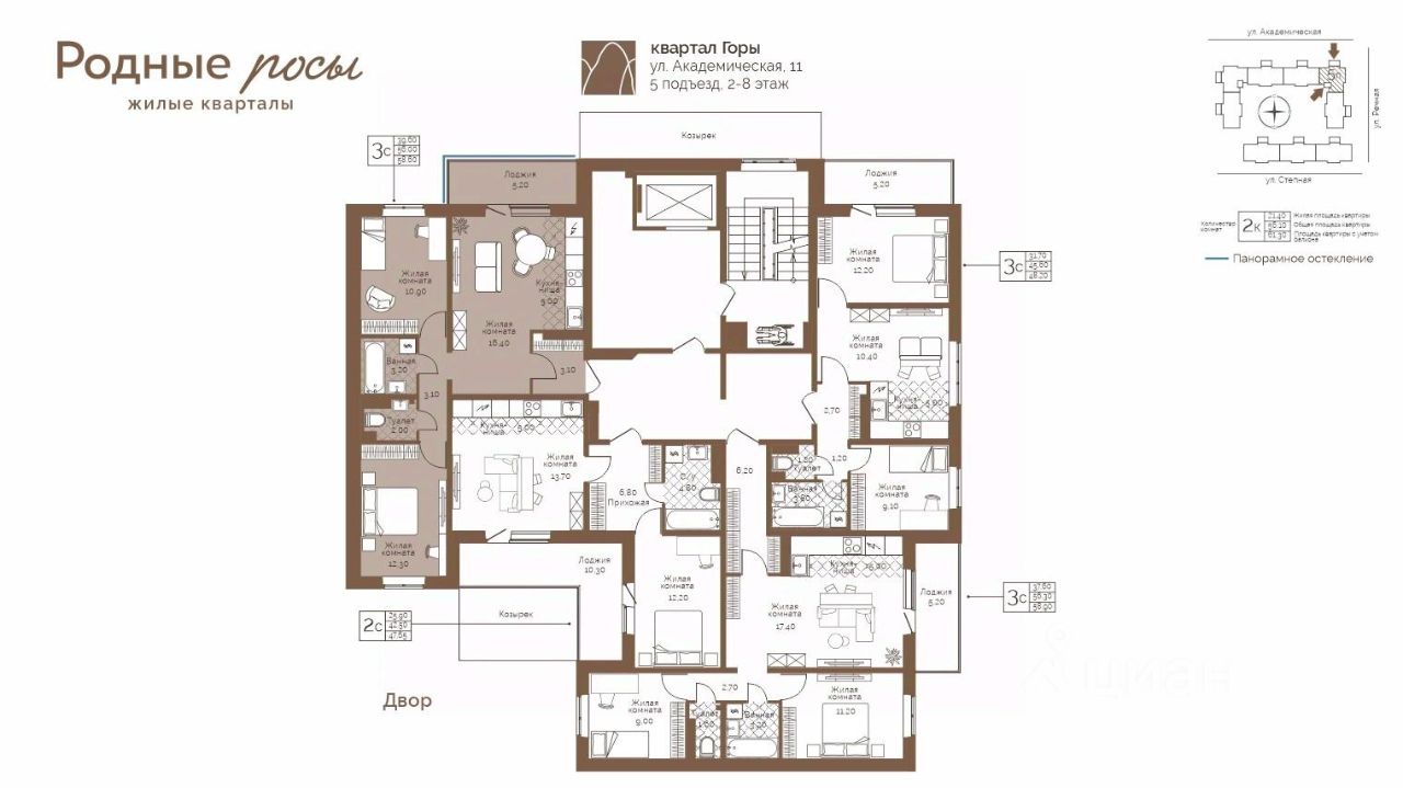 Продаётся 3-комнатная квартира в строящемся доме (Академическая, 9), срок сдачи: III-кв. 2027, общей площадью 58.6 кв.м., на 7 этаже. Новый жилой комплекс ''Родные росы'' от Специализированного застройщика ''Финпроект'' расположен в с. Фролы по ул. Академическая.
