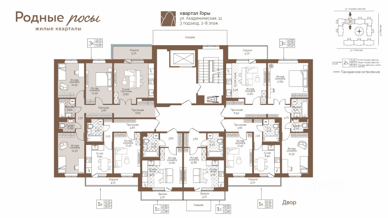 Продаётся 3-комнатная квартира в строящемся доме (Академическая, 9), срок сдачи: III-кв. 2027, общей площадью 74.8 кв.м., на 2 этаже. Новый жилой комплекс ''Родные росы'' от Специализированного застройщика ''Финпроект'' расположен в с. Фролы по ул. Академическая.