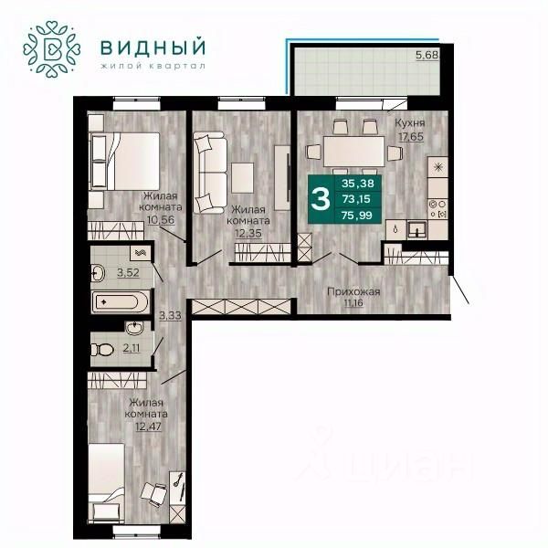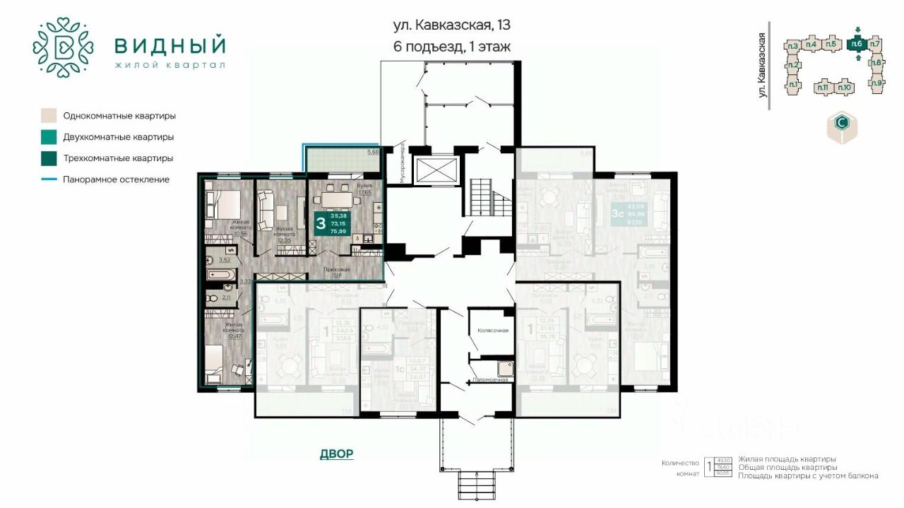 Продаётся 3-комнатная квартира в строящемся доме (корпус 2 (Кавказская, 13к2)), срок сдачи: II-кв. 2028, общей площадью 75.99 кв.м., на 1 этаже. Новый жилой комплекс ''Жилой квартал ''Видный'' от Специализированного застройщика ''СПК-Кавказская'' расположен по адресу: г. Пермь, ул. Кавказская, 13.