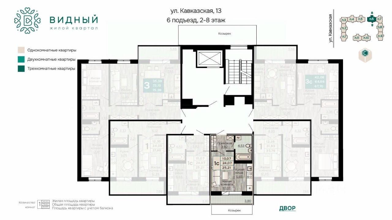 Продаётся 1-комнатная квартира в строящемся доме (корпус 2 (Кавказская, 13к2)), срок сдачи: II-кв. 2028, общей площадью 25.21 кв.м., на 5 этаже. Новый жилой комплекс ''Жилой квартал ''Видный'' от Специализированного застройщика ''СПК-Кавказская'' расположен по адресу: г. Пермь, ул. Кавказская, 13.