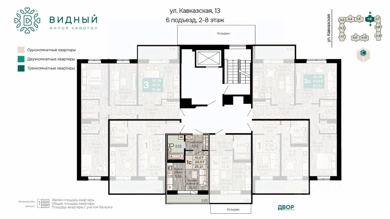 Продаётся 1-комнатная квартира в строящемся доме (корпус 2 (Кавказская, 13к2)), срок сдачи: II-кв. 2028, общей площадью 25.21 кв.м., на 7 этаже. Новый жилой комплекс ''Жилой квартал ''Видный'' от Специализированного застройщика ''СПК-Кавказская'' расположен по адресу: г. Пермь, ул. Кавказская, 13.