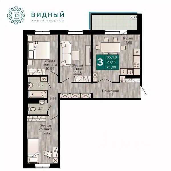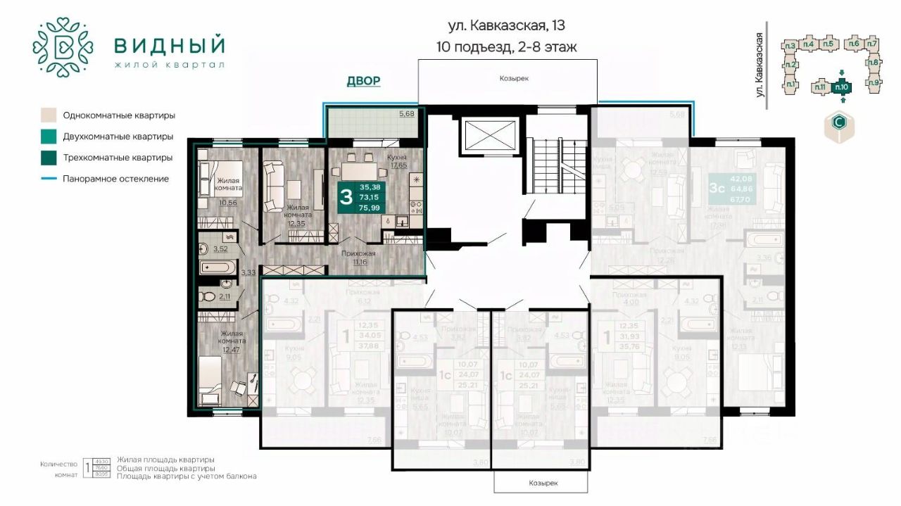 Продаётся 3-комнатная квартира в строящемся доме (корпус 2 (Кавказская, 13к2)), срок сдачи: II-кв. 2028, общей площадью 75.99 кв.м., на 8 этаже. Новый жилой комплекс ''Жилой квартал ''Видный'' от Специализированного застройщика ''СПК-Кавказская'' расположен по адресу: г. Пермь, ул. Кавказская, 13.