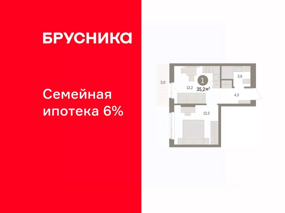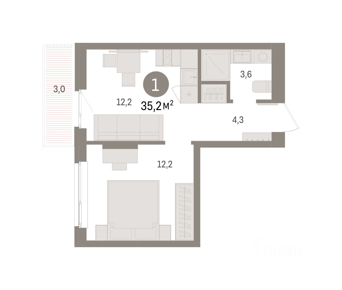 Квартира с кухней-гостиной и одной спальней в квартале ''Юность''. Особенности планировки: балкон. квартиры в нашей базе: ЮСТ01-Ж3.5.5.