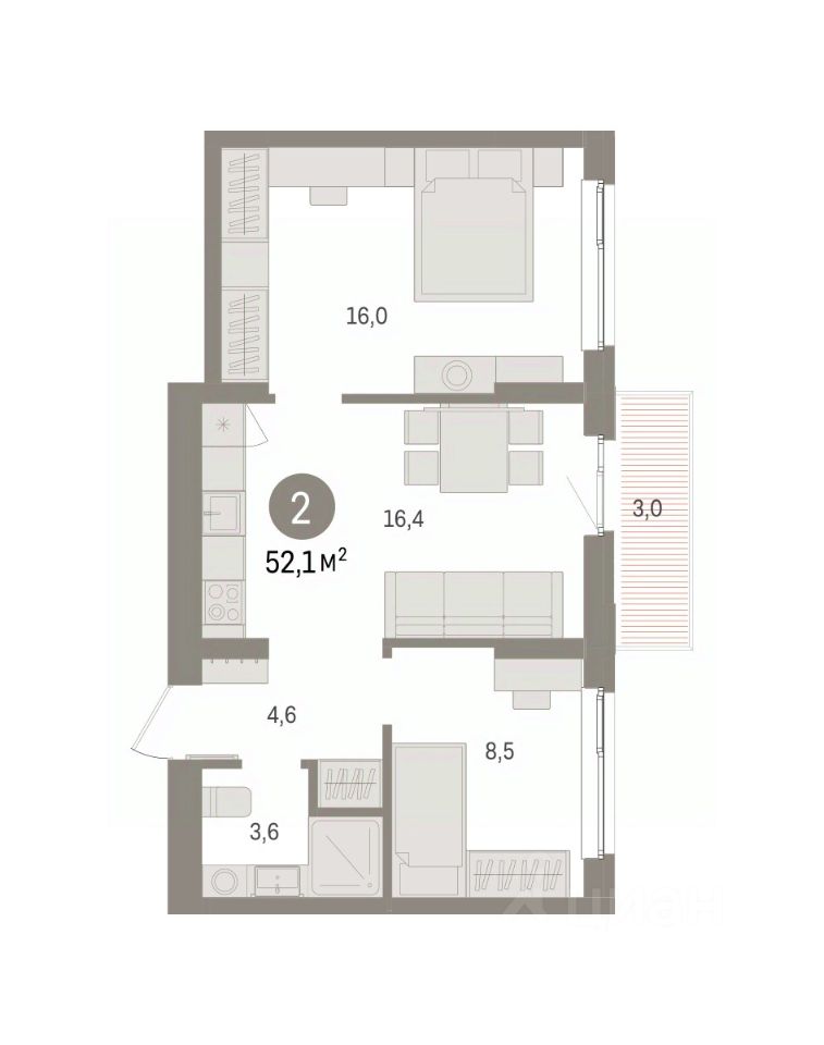Квартира с кухней-гостиной и двумя спальнями в квартале ''Юность''. Особенности планировки: балкон, вид во двор, разнесённые спальни. квартиры в нашей базе: ЮСТ01-Ж2.8.8.