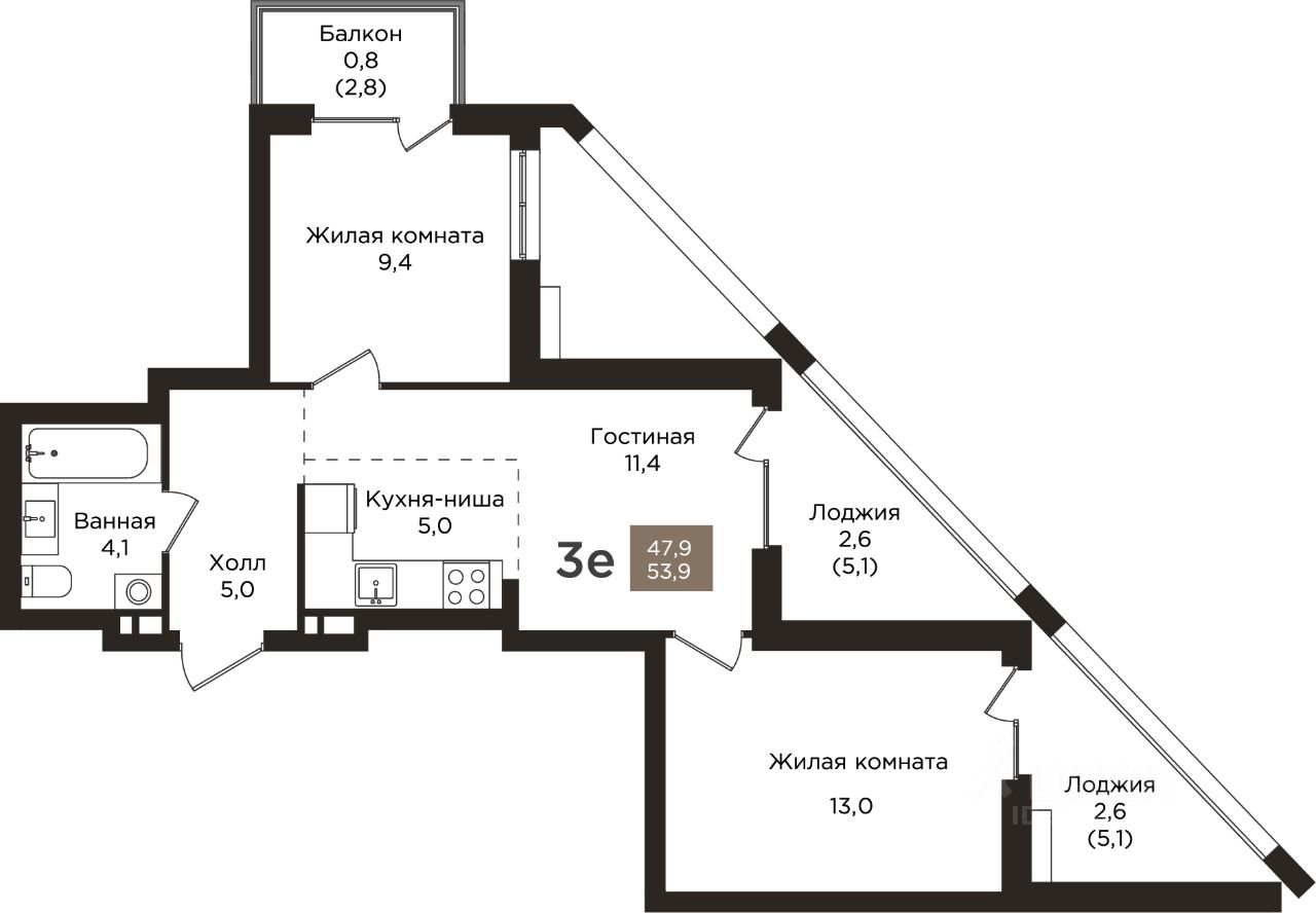 Общая площадь53,9 м2