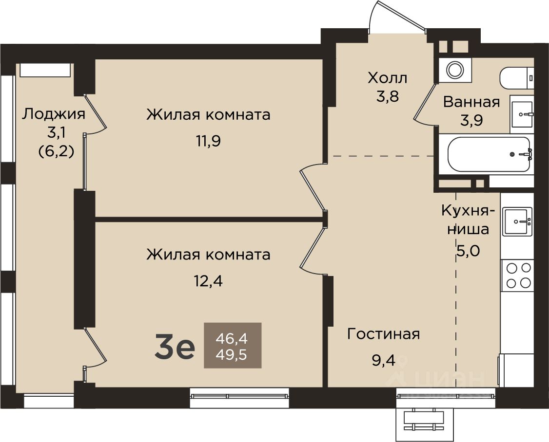 Общая площадь49,5 м2