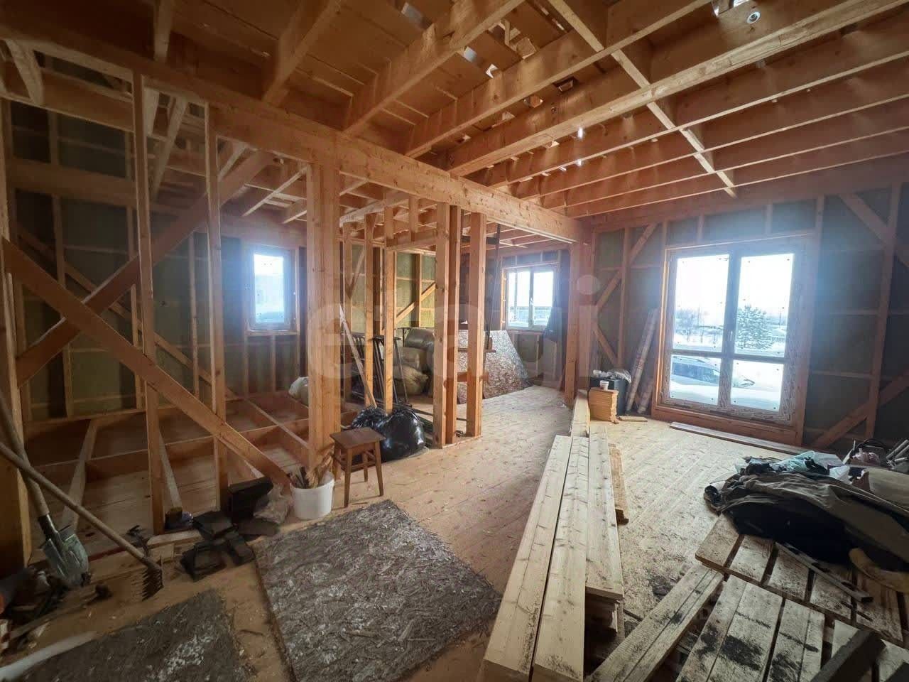Продается земельный участок площадью 7,5 соток правильной формы с возведенным каркасным домом в деревне Залесная. Общая площадь двухэтажного строения составляет 105 кв.м. Объект находится на стадии незавершенного строительства, что позволяет будущему владельцу самостоятельно выбрать финишные материалы и планировочные решения в рамках готового конструктива. Основные работы уже выполнены: возведен каркас из бруса, смонтированы лаги пола и кровли, уложен утеплитель, установлены окна и входная группа ПВХ. Все инженерные коммуникации подведены к дому — имеется собственная скважина и локальная канализация, что является значительным преимуществом. Планировка функциональна: на первом этаже запланированы просторный холл, объединенная гостиная-кухня и санузел, на втором — три изолированные спальни. Лестница на второй этаж требует монтажа. Для точного расчета бюджета на завершение работ имеется готовая смета. Участок отличается развитой инфраструктурой: остановка общественного транспорта находится в 5 минутах ходьбы, а природный ландшафт с хвойными деревьями создает приватную и спокойную атмосферу. Это рациональная возможность создать современное жилье для постоянного проживания или загородного отдыха с учетом личных предпочтений и контролем качества на финальном этапе строительства.