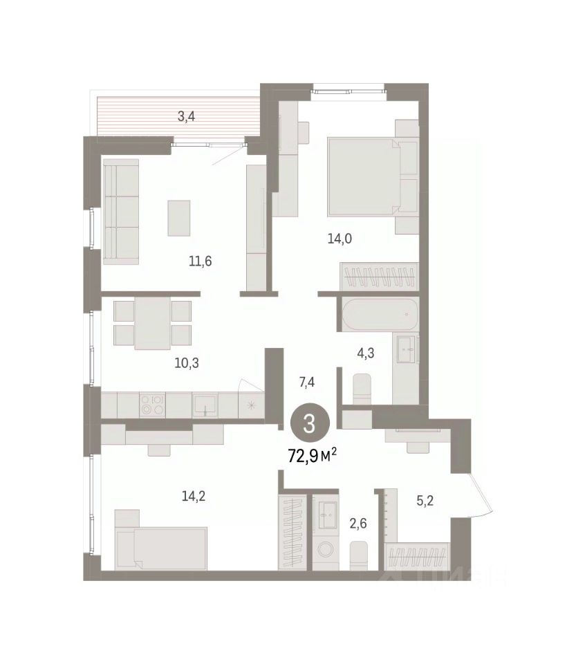 Квартира с кухней-гостиной и тремя спальнями в квартале ''Юность''. Особенности планировки: балкон, вид во двор, второй санузел, разнесённые спальни. квартиры в нашей базе: ЮСТ01-Ж1.5.2.