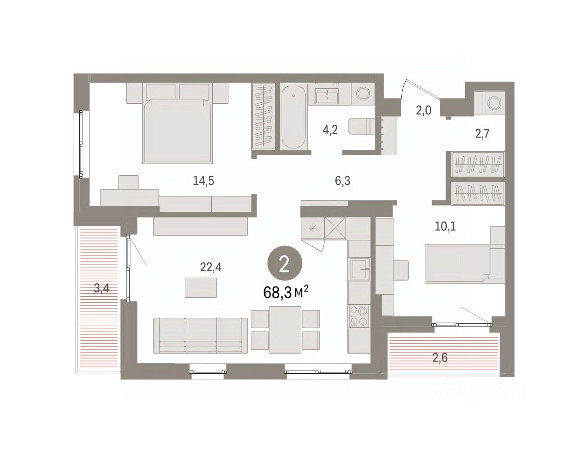 Квартира с кухней-гостиной и двумя спальнями в квартале ''Юность''. Особенности планировки: балкон, постирочная, разнесённые спальни. квартиры в нашей базе: ЮСТ01-Ж4.3.2.