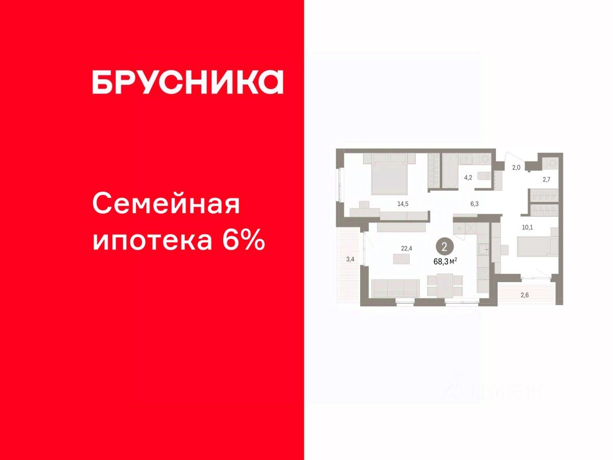 Просторная двухкомнатная квартира с предчистовой отделкой в ЖК ''Квартал ''Юность'''' на 3 этаже. Общая площадь: 68.26 кв.м., жилая: 24.6 кв.м., площадь просторной кухни-гостиной: 22.4 кв.м. Квартира угловая, очень светлая, естественная вентиляция при открытии окон. В квартире две лоджии, один совмещенный санузел. Высота потолков 2.7 м.