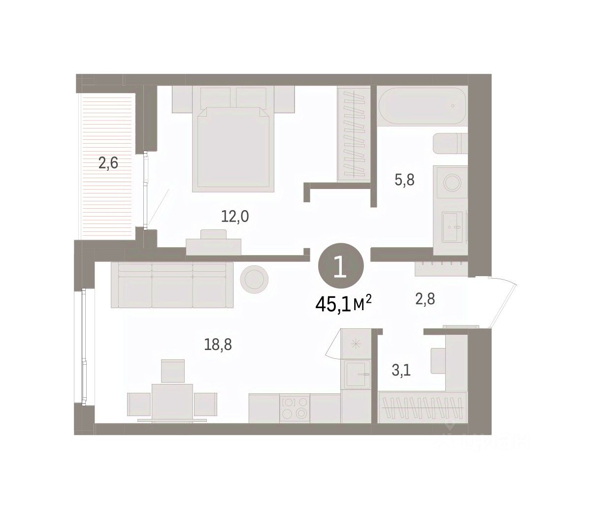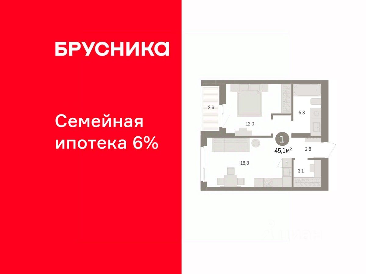 Квартира с кухней-гостиной и одной спальней в квартале ''Юность''. Особенности планировки: гардеробная, лоджия. квартиры в нашей базе: ЮСТ01-Ж4.4.3.