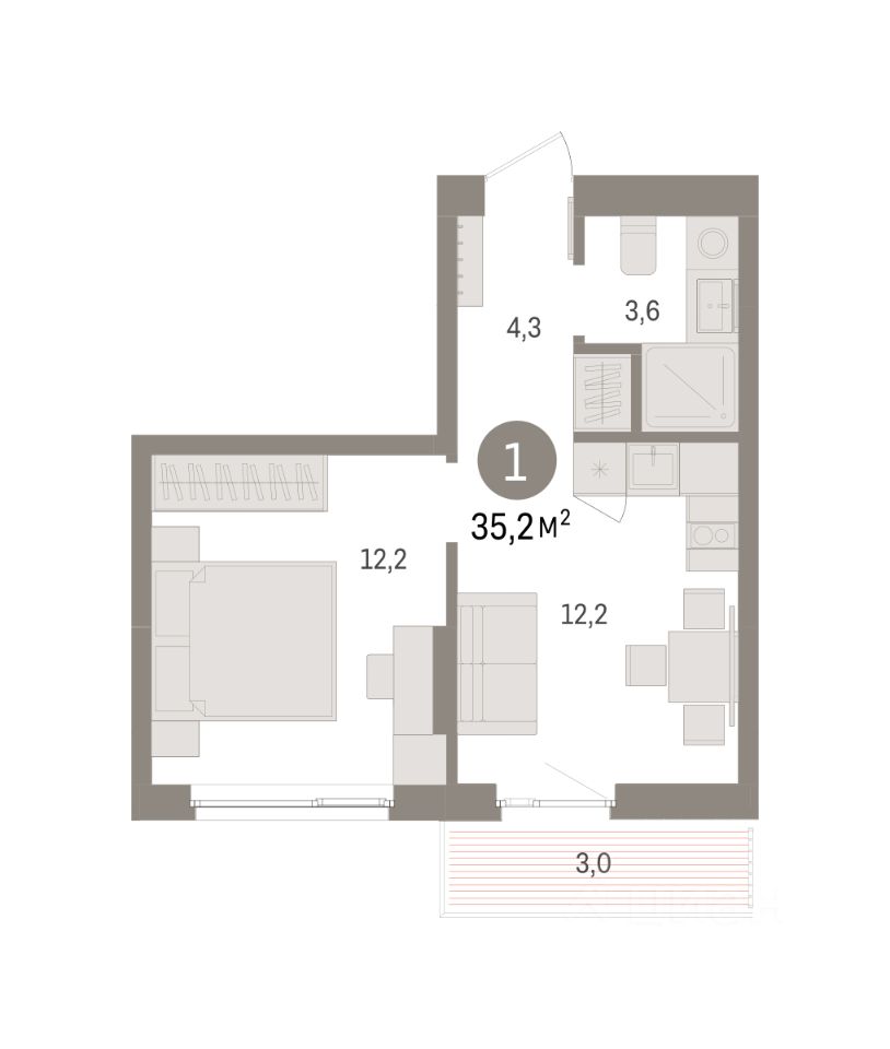 Квартира с кухней-гостиной и одной спальней в квартале ''Юность''. Особенности планировки: балкон. квартиры в нашей базе: ЮСТ01-Ж5.5.4.