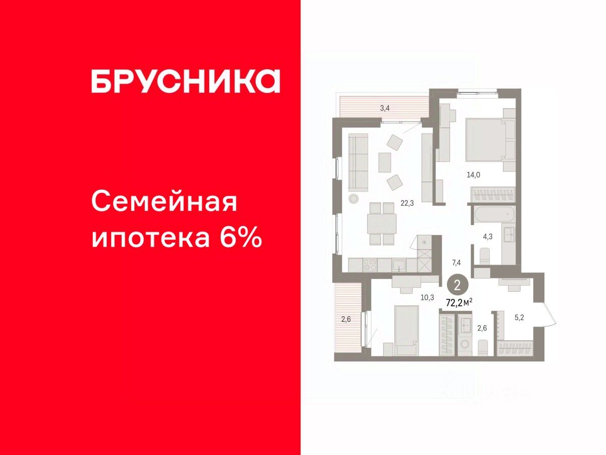 Квартира с кухней-гостиной и двумя спальнями в квартале ''Юность''. Особенности планировки: вид во двор, второй санузел, лоджия, разнесённые спальни. квартиры в нашей базе: ЮСТ01-Ж1.4.3.