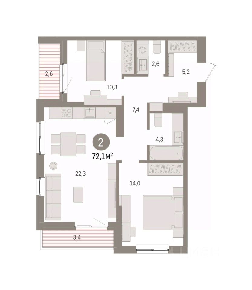 Квартира с кухней-гостиной и двумя спальнями в квартале ''Юность''. Особенности планировки: вид во двор, второй санузел, лоджия, разнесённые спальни. квартиры в нашей базе: ЮСТ01-Ж1.14.2.