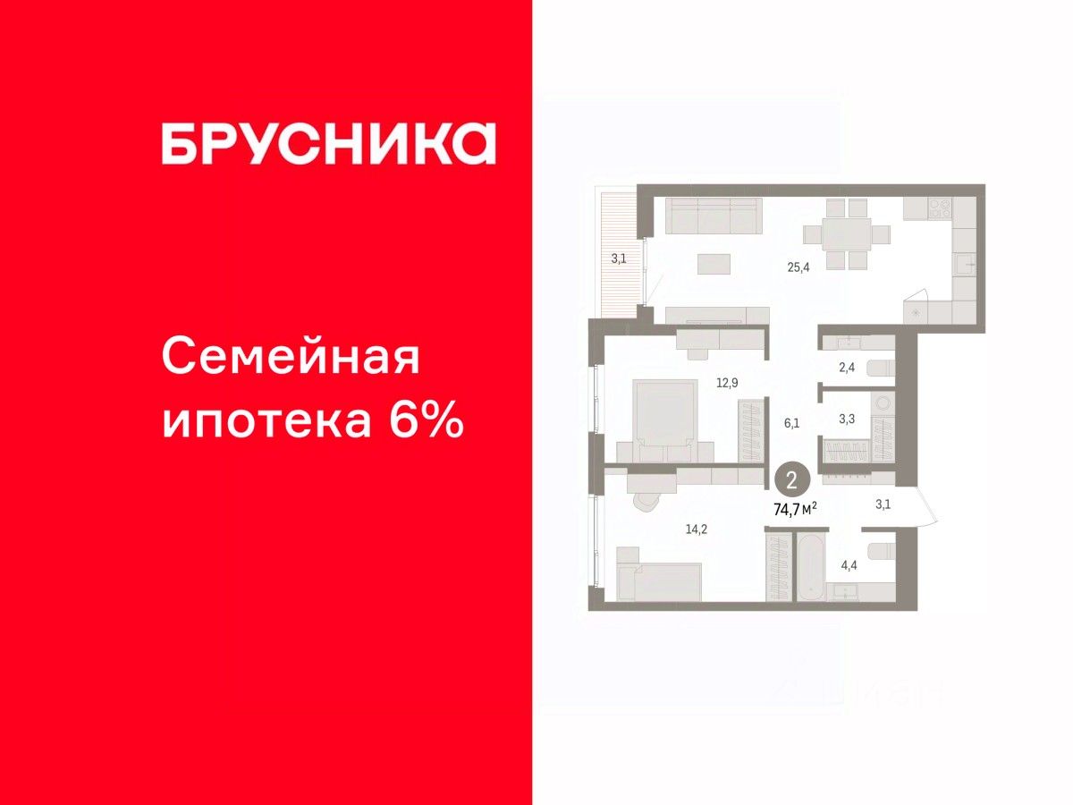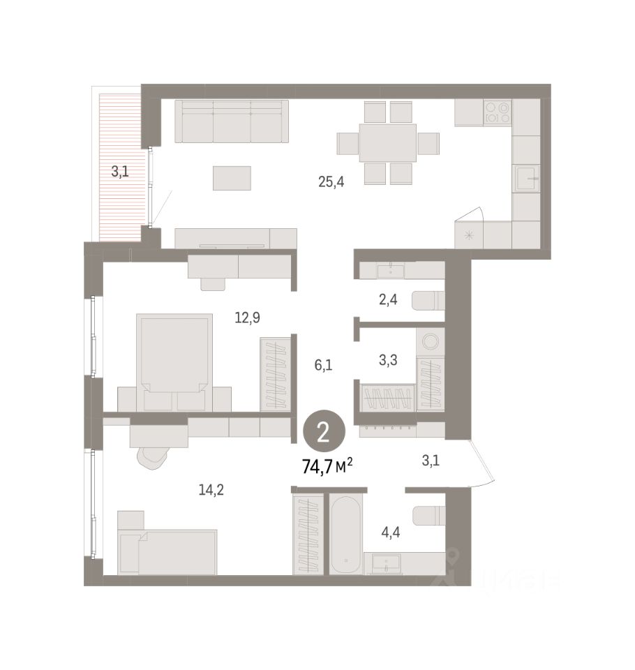 Квартира с кухней-гостиной и двумя спальнями в квартале ''Юность''. Особенности планировки: балкон, второй санузел, гардеробная, разнесённые спальни. квартиры в нашей базе: ЮСТ01-Ж4.7.6.