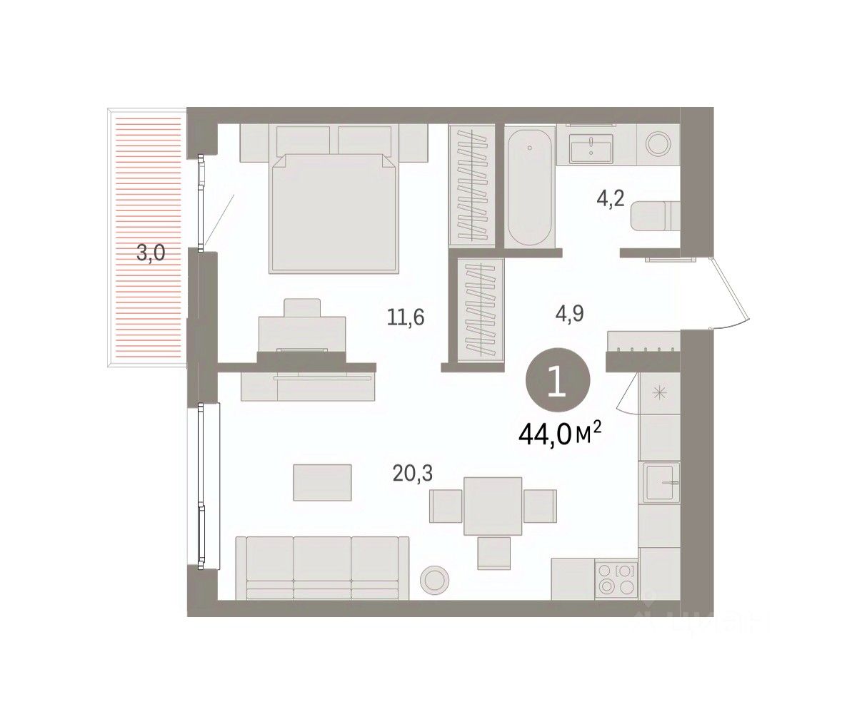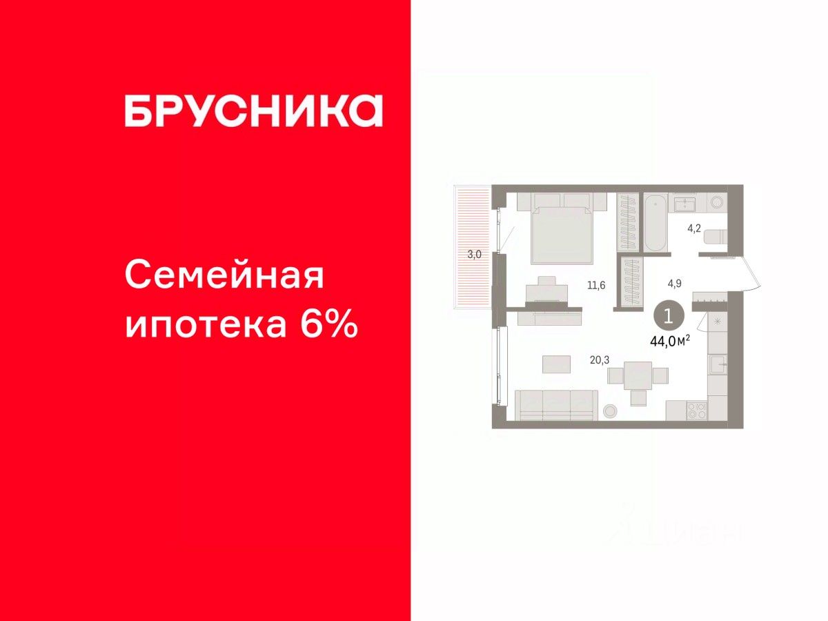 Квартира с кухней-гостиной и одной спальней в квартале ''Юность''. Особенности планировки: балкон. квартиры в нашей базе: ЮСТ01-Ж2.2.6.