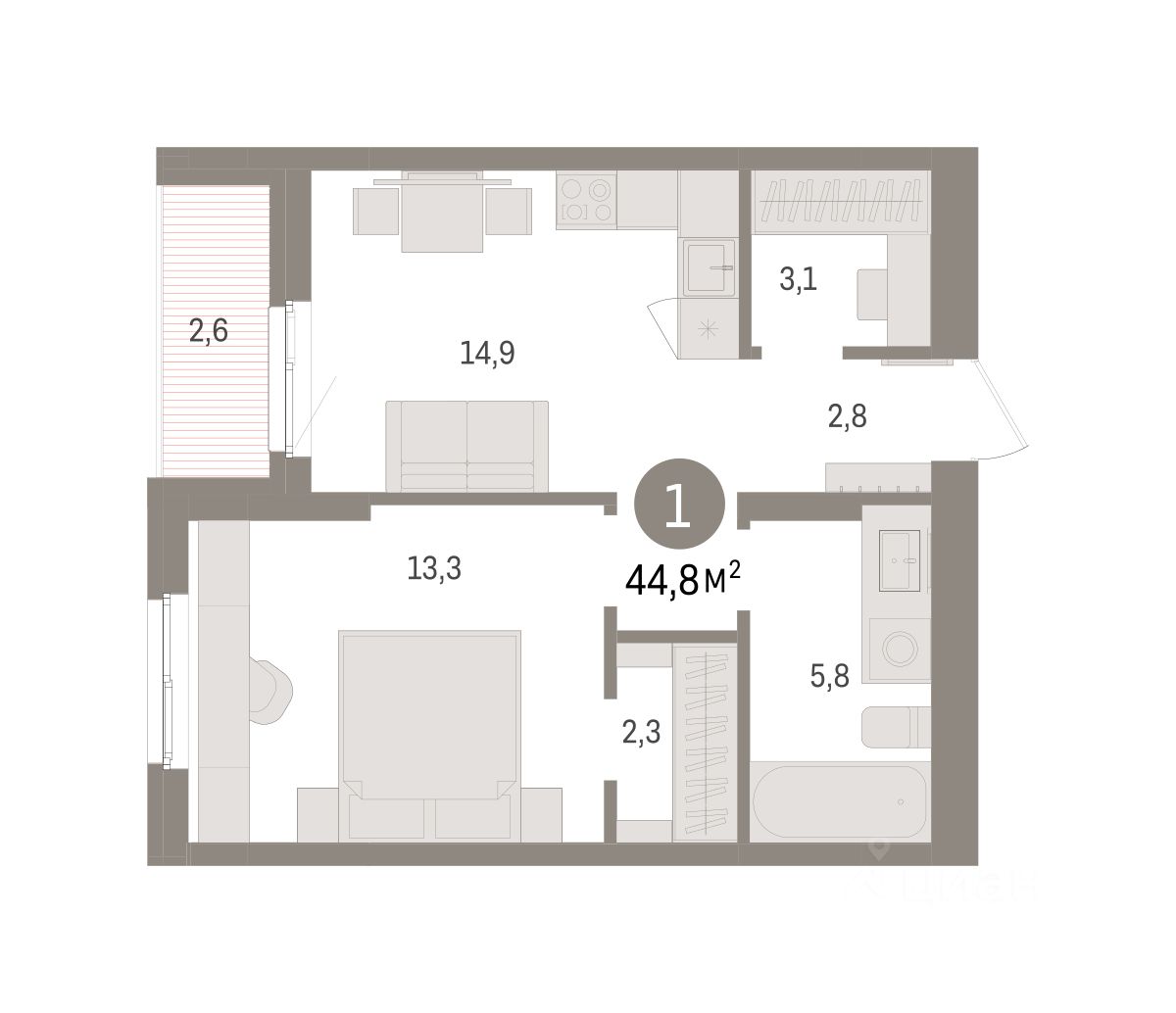 Общая площадь44,8 м2