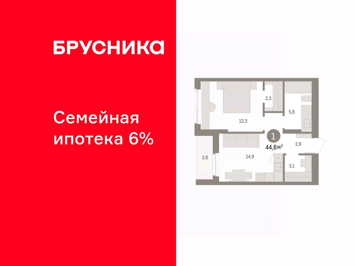 Просторная 1-комн. квартира с предчистовой отделкой в ЖК ''Квартал ''Юность'''' на 6 этаже. Общая площадь: 44.8 кв.м., жилая: 13.3 кв.м., площадь просторной кухни-гостиной: 14.9 кв.м. Все окна выходят на одну сторону. В квартире одна лоджия, один совмещенный санузел. Высота потолков 2.7 м.