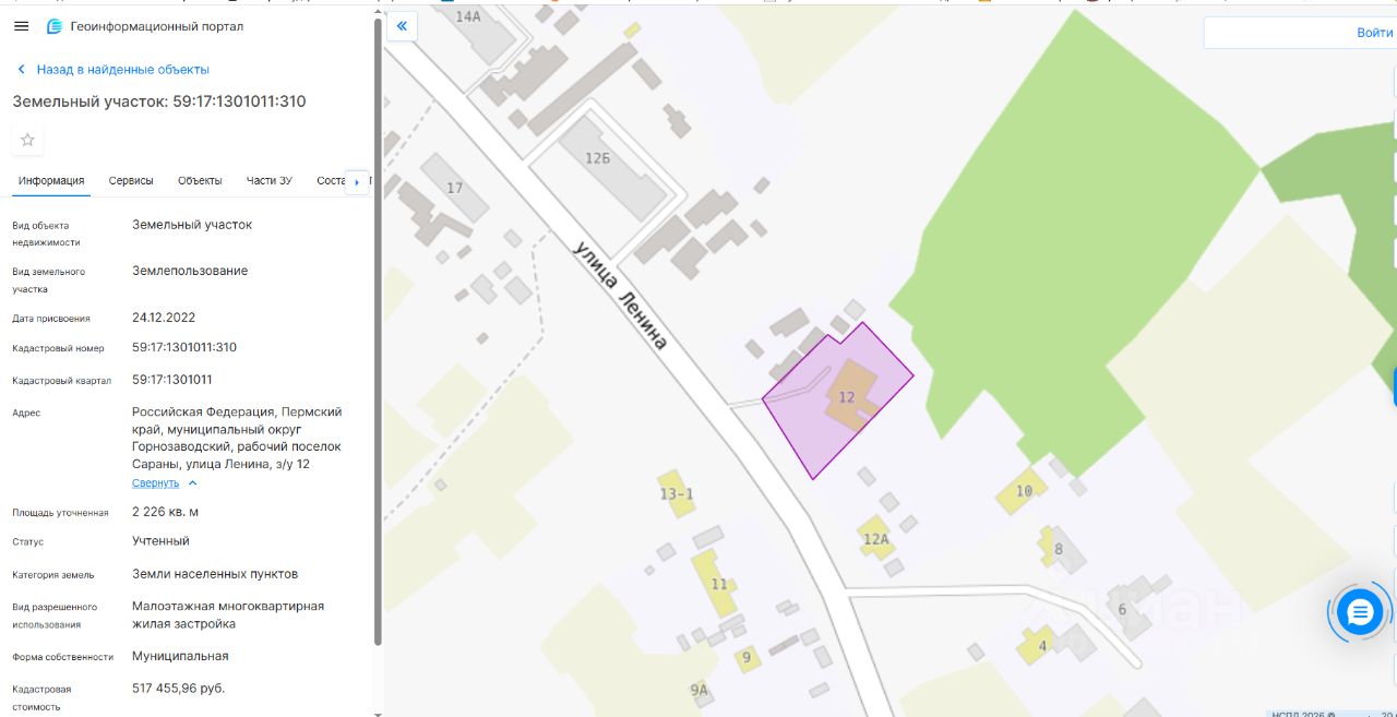 Пермский край, Горнозаводский м.о., р.п.Сараны, ул. Ленина, з/у 12