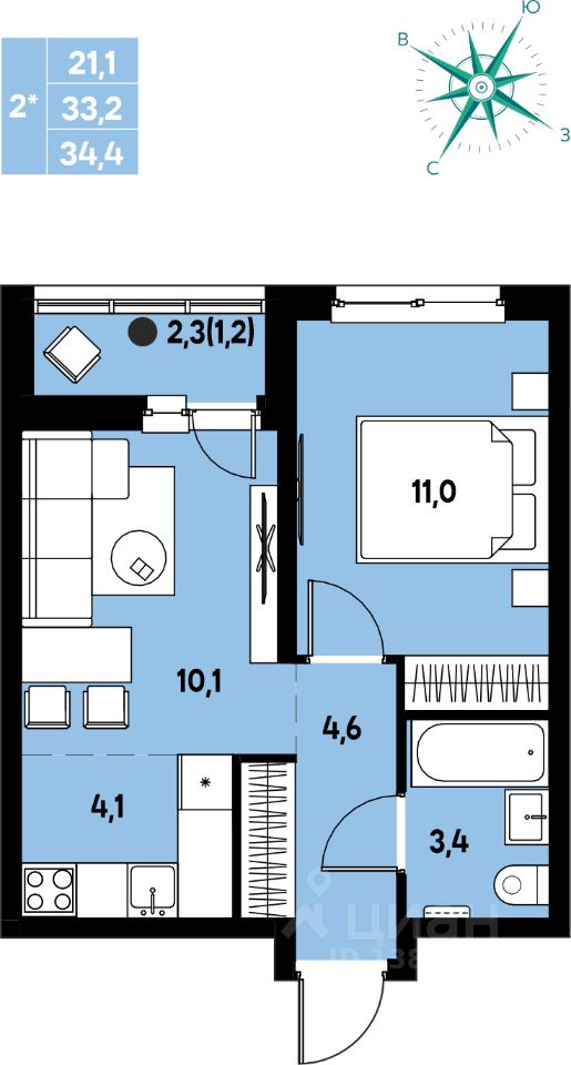 Общая площадь34,4 м2