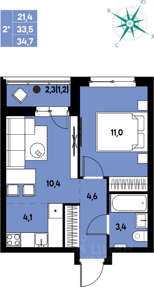 Общая площадь34,7 м2