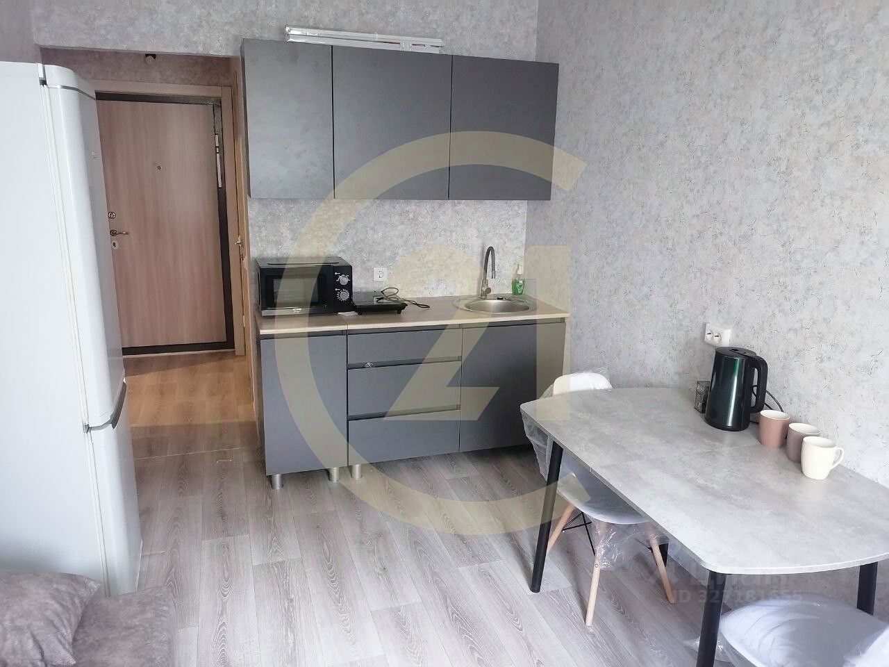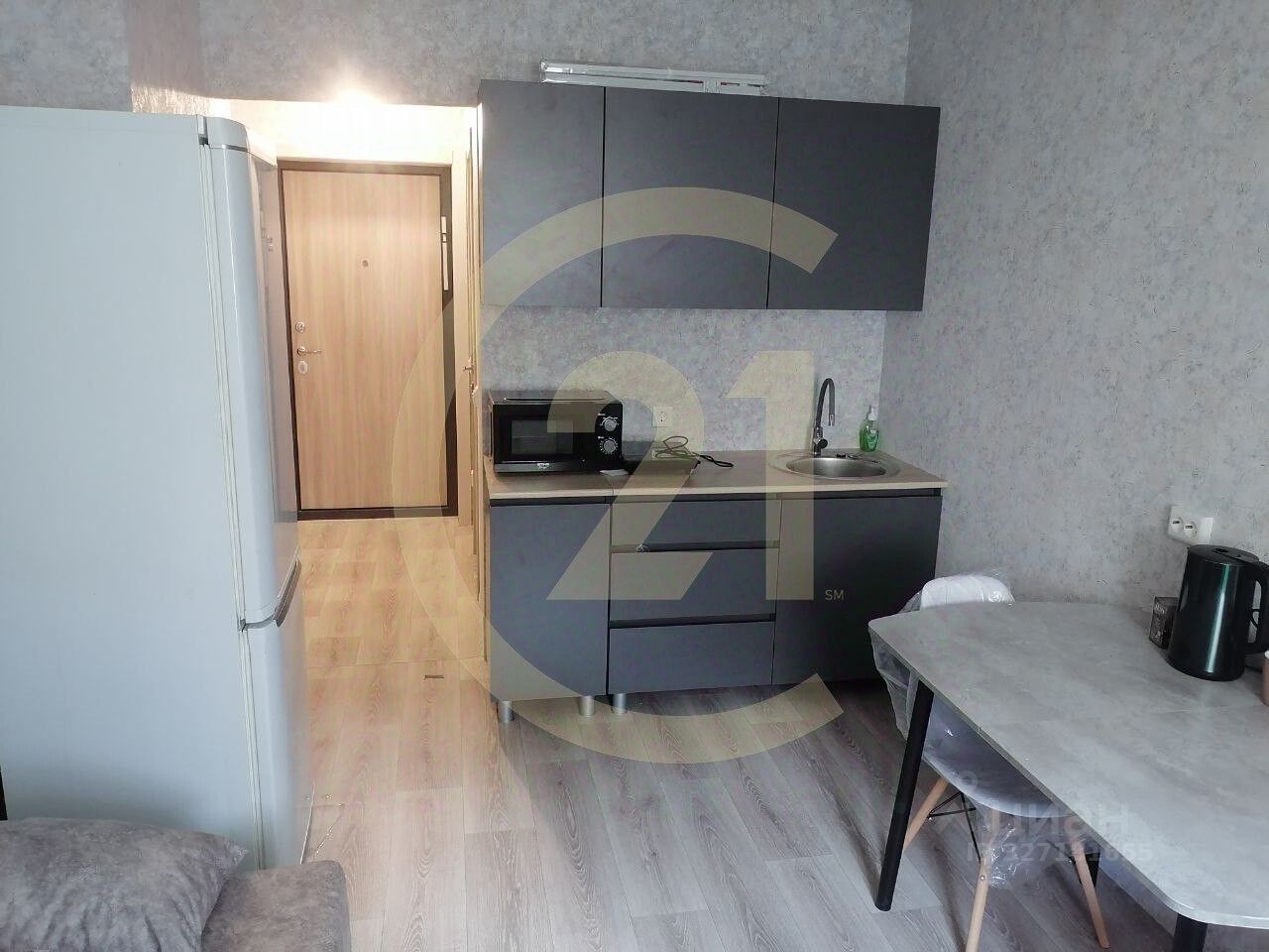 В квартире есть мебель и техника для того, чтобы заехать и жить: стиральная машина, холодильник, микроволновая печь, чайник, плитка, кухонный гарнитур, диван, шкаф, стол, стулья.