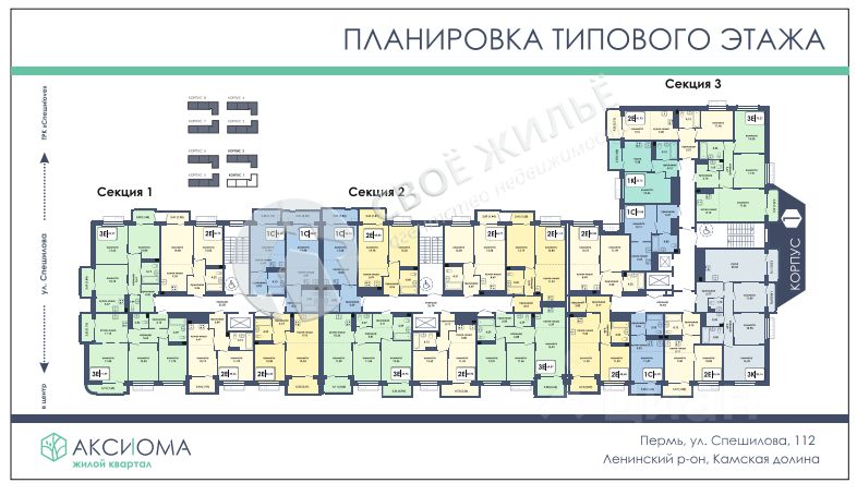 ЖК ''АКСИОМА'' - привычные дома высотой 8-10 этажей. Срок сдачи первого дома начало 2027 года. Более 30 видов планировок, квартиры с террасами на верхних этажах.