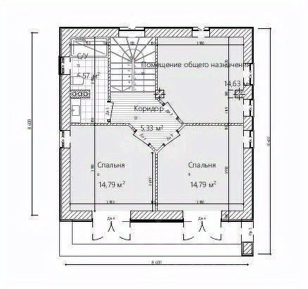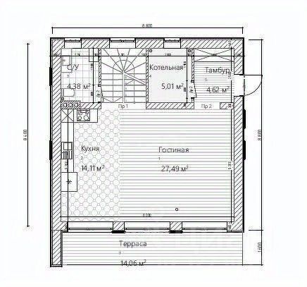 • 1 этаж — просторная кухня-гостиная с выходом на террасу , ванная, прихожая и котельная.