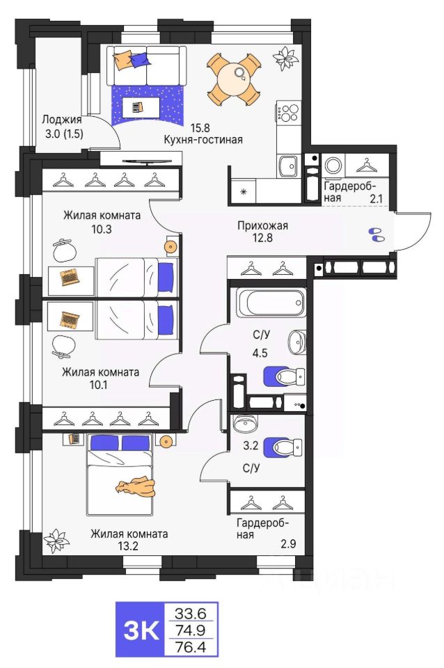 Продается 3- комнатная квартира 192 Выгода на квартиры в ЖК Моменты до 500 000 руб*