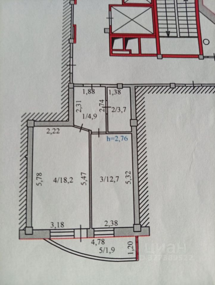 Общая площадь: 39,5 кв. м + лоджия 6 кв.м - Высота потолков: 2,76 м — создает ощущение простора и воздуха. - Планировка позволяет организовать несколько жилых комнат, просторную кухню-гостиную и все необходимые подсобные помещения. - Санузел.