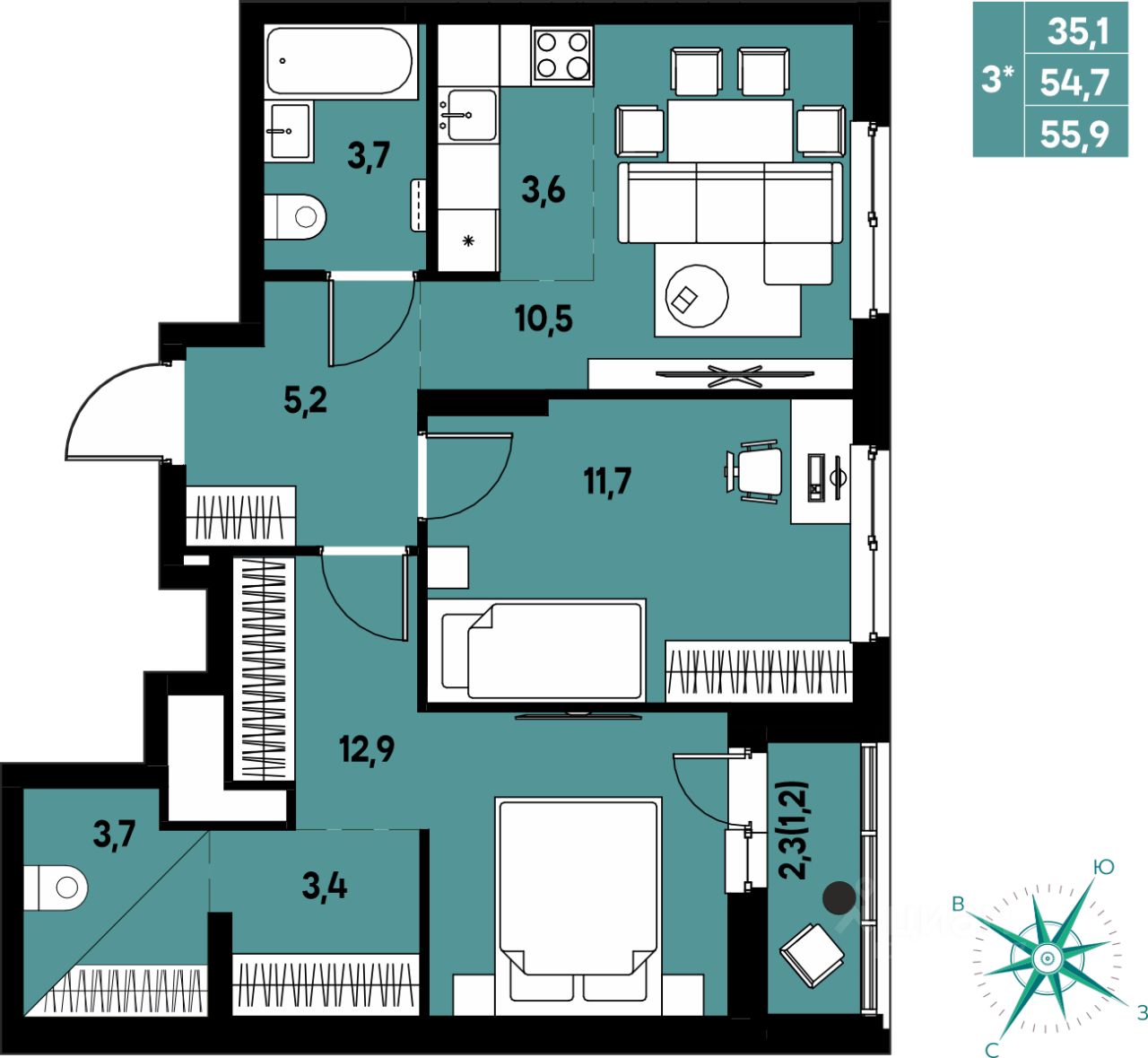 Продаётся 3-комнатная квартира в строящемся доме (Улановой, 5), срок сдачи: III-кв. 2027, общей площадью 55.9 кв.м., на 10 этаже. Новый жилой комплекс ''Клубный пригород ''МЫ'' от застройщика ''Девелопмент-ЮГ'' расположен по адресу д. Кондратово, пр-т Дягилева, 4.